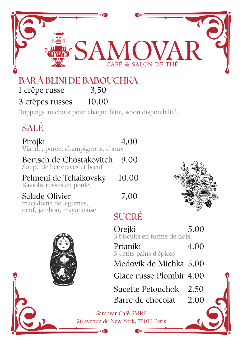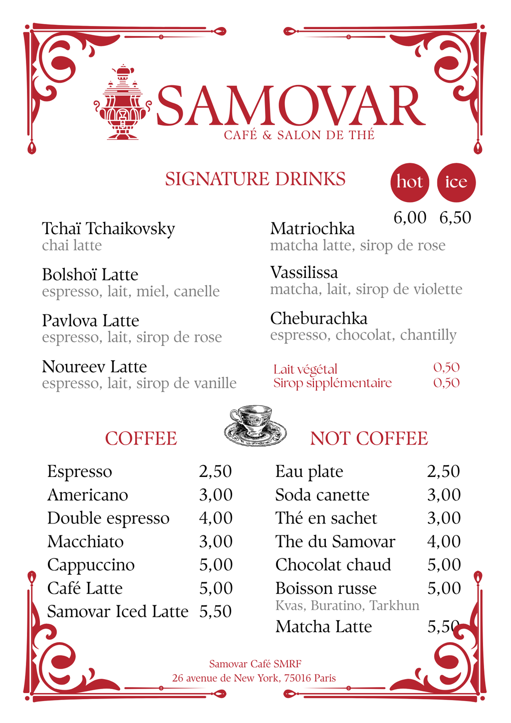 Le Samovar Café propose également des cafés de spécialité signés Terre de Café, du matcha de la maison Matcha Botanicals, des thés de qualité, ainsi qu’une gamme de boissons sans alcool (boissons russes, kvas, tarhun, softs…).